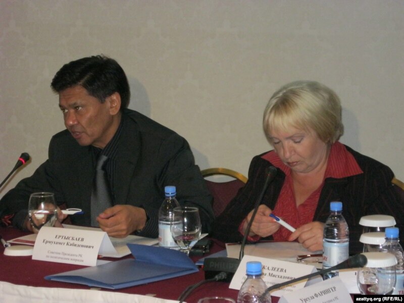 Қазақстан президентінің кеңесшісі Ермұхамет Ертісбаев (сол жақта) пен "Әділ сөз" қорының басшысы Тамара Калеева. Астана, 27 қыркүйек 2010 жыл