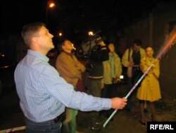 Заңгер Сергей Уткин "Комета S" баспаханасының ауласын көру мақсатында петард атып тұр. Алматы, 24 қыркүйек 2009 жыл.