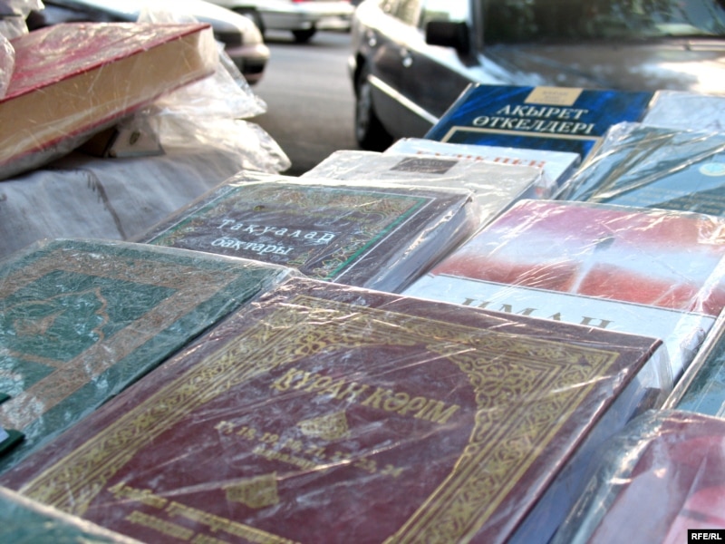 Алматының орталық мешіті жанындағы жайма базарда сатылып жатқан діни әдебиеттер мен аудиотаспалар. 2 қазан, 2009 жыл.