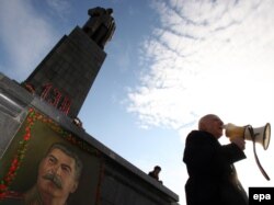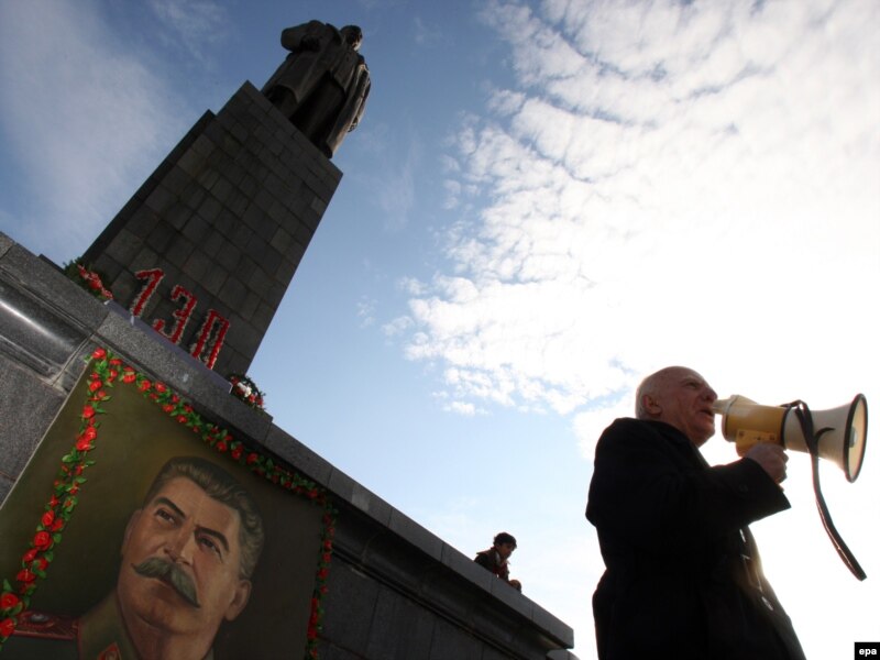 Гори қаласының тұрғыны Сталиннің туған күні оның ескерткіші алдында, совет көсемінің айтып кеткен сөзін еске алып, ұрандатып тұр. Грузия, 21 желтоқсан 2009 жыл.