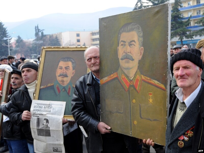 Сталинді дәріптеушілер совет көсемінің туған күні қаланың орталық алаңында оның суретін ұстап тұр. Грузия, Гори қаласы, 21 желтоқсан 2009 жыл.