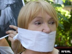 «Әділ сөз» қоғамдық қорының президенті Тамара Калеева сөз бостандығын қорғауға арналған наразылық акциясында. Алматы, 24 маусым 2009 жыл.