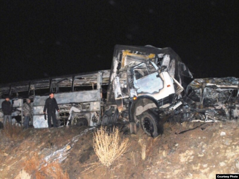 Полицияның айтуынша, автобус қарсы келе жатқан жүк көлігіне соқтығысып жанып кеткен. 13 қазан 2010 жыл.