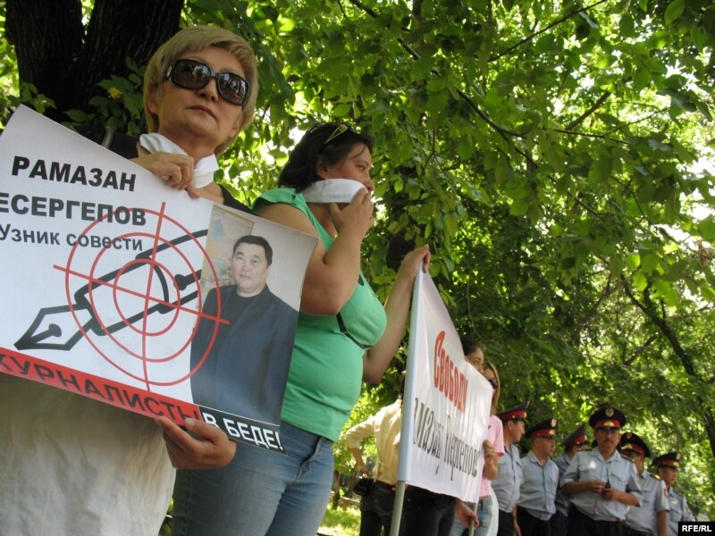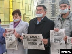 Абақтыда отырған журналист Рамазан Есіргеповтың әйелі Раушан Есіргепова (сол жақта) баспасөзді қудалауға наразылық таныту шарасында тұр. Алматы, 24 маусым, 2009 жыл.