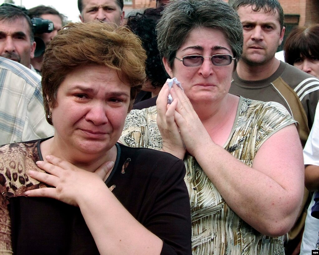 Бесландағы мектептің сыртында жылап тұрған ата-аналар. 1 қыркүйек 2014 жыл.