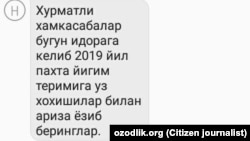"Құрметті әріптестер, бүгін жұмысқа келіңіздер және 2019 жылы мақта теріміне ерікті түрде баратындарыңыз туралы қолхат жазыңыздар" делінген Әндіжан аймақтық электр желісі кәсіпорыны қызметкерлеріне жіберілген хатта.