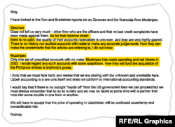 Өзбекстан бас прокуратурасының тапсырмасымен 2005 жылы жүргізілген аудиторлық тексеру CCBU-де болған ұрлық пен алаяқтық кесірінен үкіметке 6 млн доллар шығын келді деген қорытынды шығарған. Аудиторлық тексеруге тікелей қатысқан бір дереккөздің айтуынша, "бүкіл процестің" мақсаты – өзбек үкіметінің Roz Trading акцияларын тартып алуын ақтау болған.