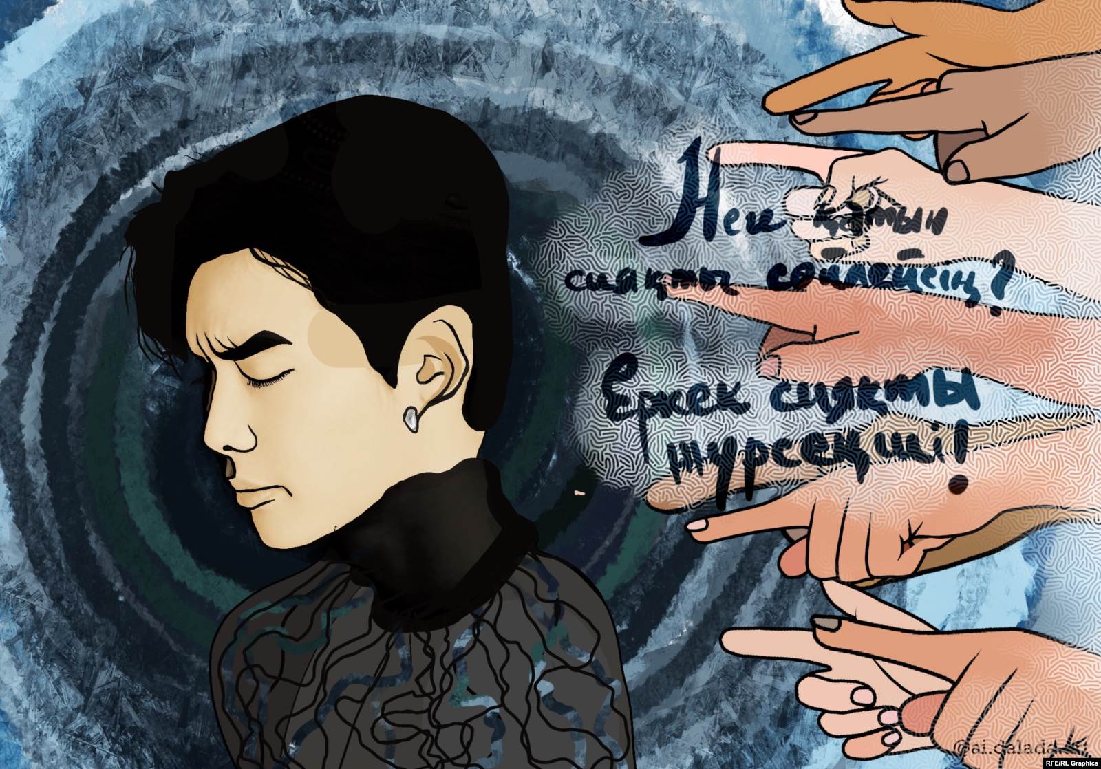 Оңтүстік өңірде туып, консеративті отбасыдан, ауылдан шыққандықтан отбасыға рухани тәуелдімін. Баласын барлық болмысымен қабылдайтын ата-ана өте аз. Оқыған, әлем көрген, заманауи ой-пікірі бар ата-ана ғана баласын қолдар. Егер баласының ЛГБТ өкілі екенін білсе, көп ата-ана перзентінен бас тартуға дайын. Қорқынышты. Қоғам баланы ата-анаға қарыздар етіп қояды. Ата-анасынан кетіп өмір сүре алмайды. Тәрбие солай берілген, сондықтан ата-анамызды да көп алдаймыз.