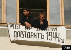 Пәтерлерінен шығарылып жатқан Қырым татарлары "Біз 1944 жылдың қайталануына жол бермейміз!" деп наразылық танытып тұр Алушта, 16 қараша, 2001 жыл.