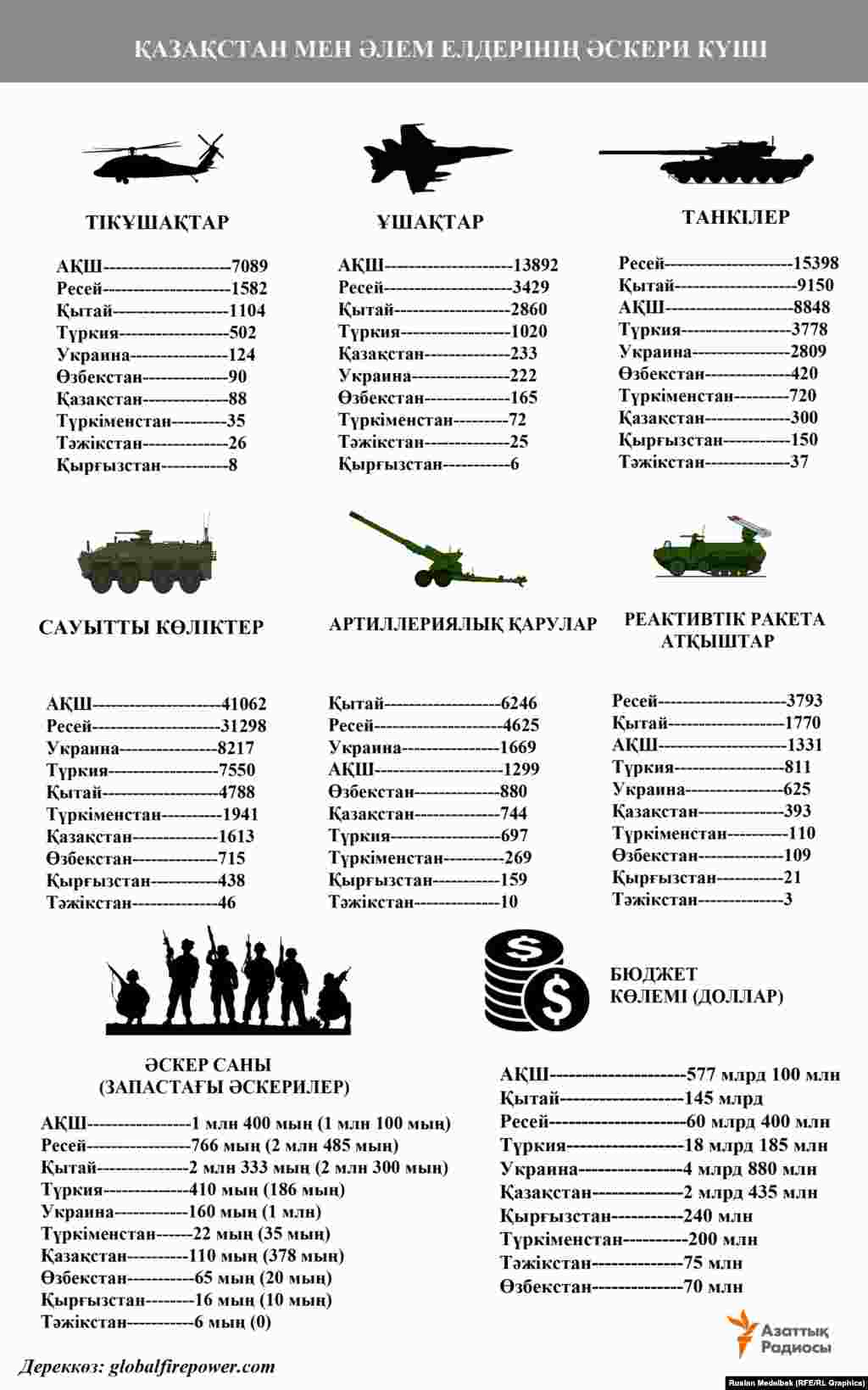 Қазақстан мен көршілерінің және әлемдегі кейбір елдердің әскери күштері туралы мәлімет.