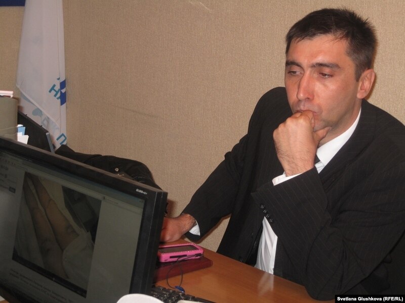 Құқық қорғаушы Вадим Курамшин қайтыс болған тұтқын Арман Қапаровтың денесіндегі көгерген дақты түсірген видеоны көрсетіп отыр. Астана, 3 қазан 2011 жыл.