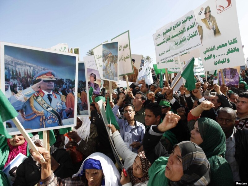 Триполиде үкіметті жақтаушылар Муаммар Каддафидің суретін ұстап шеру өткізді. Ливия, 17 ақпан 2011 жыл.