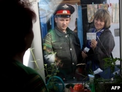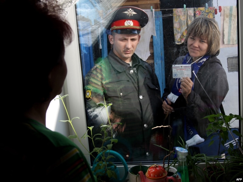 Халық санағына мәлімет жинауға милиция қызметкерімен бірге келген санақшы жергілікті тұрғынға өз құжатын көрсетіп тұр. Кемеров, 14 қазан 2010 жыл.