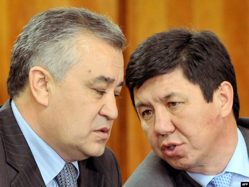 Уақытша үкіметтің қаржы министрі Темір Сариев (оң жақта) пен вице-премьер Өмірбек Текебаев (сол жақта) баспасөз-мәслихатында. Бішкек, 8 сәуір, 2010 жыл.