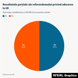 Дүйсенбі күні таңертең референдумға дауыс беру қорытындысы туралы хаттамалардың 98,29 пайызға жуығы саналып бітті. Ондағы мәліметтер бойынша, дауыс беруге қатысқан Молдова азаматтары арасында елдің Еуропа Одағына қосылуына қарсылар мен Еуроодаққа кіруді қолдаушылар саны бірдей болып тұр.
