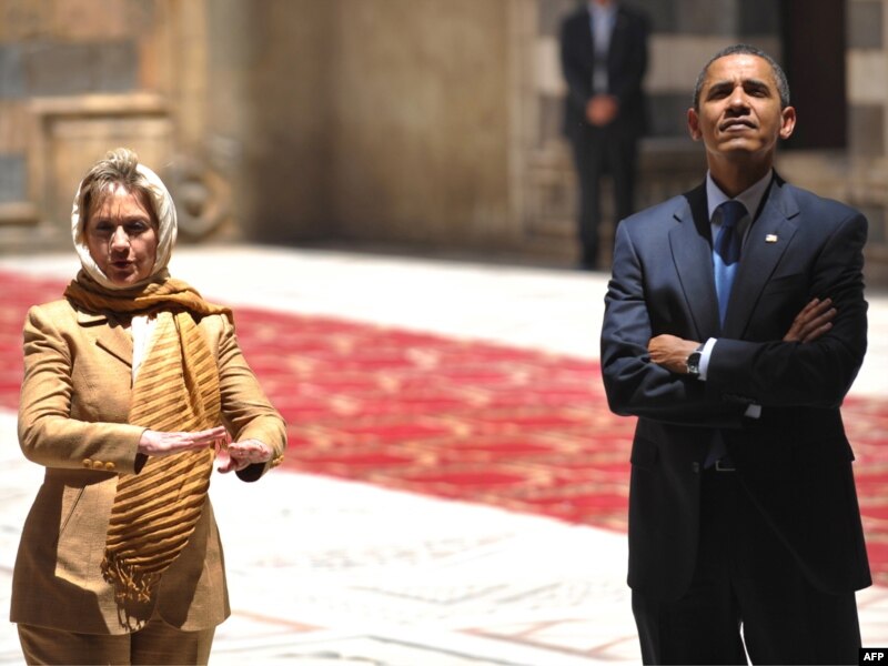 АҚШ президенті Барак Обама мен мемлекеттік хатшысы Хилари Клинтон Каирдегі Сұлтан Хасан мешітінде. 4 маусым 2009 жыл