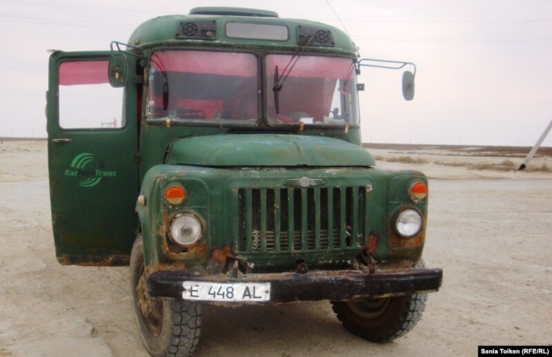 «Жылыоймұнайгаз» өндіру басқармасы мұнайшыларын таситын автокөлік. Атырау облысы, Прорва кеніші, 26 сәуір 2010 жыл.