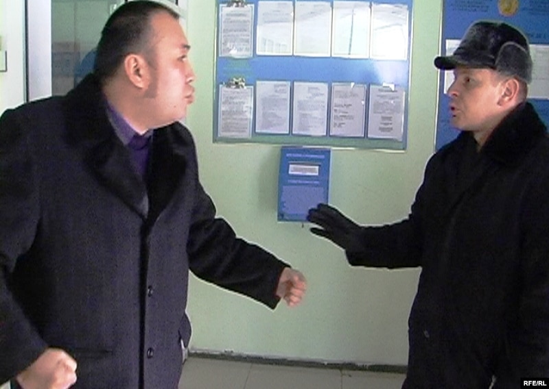 Жәмила Жәкішеваға күш көрсетпек болған Адвокат Болат Исатаевтың (сол жақта) іс-әрекетіне оқиғаға куәгер болғандар араласып, әйелді қорғап қалды. Астана, 199 қаңтар 2010 жыл.