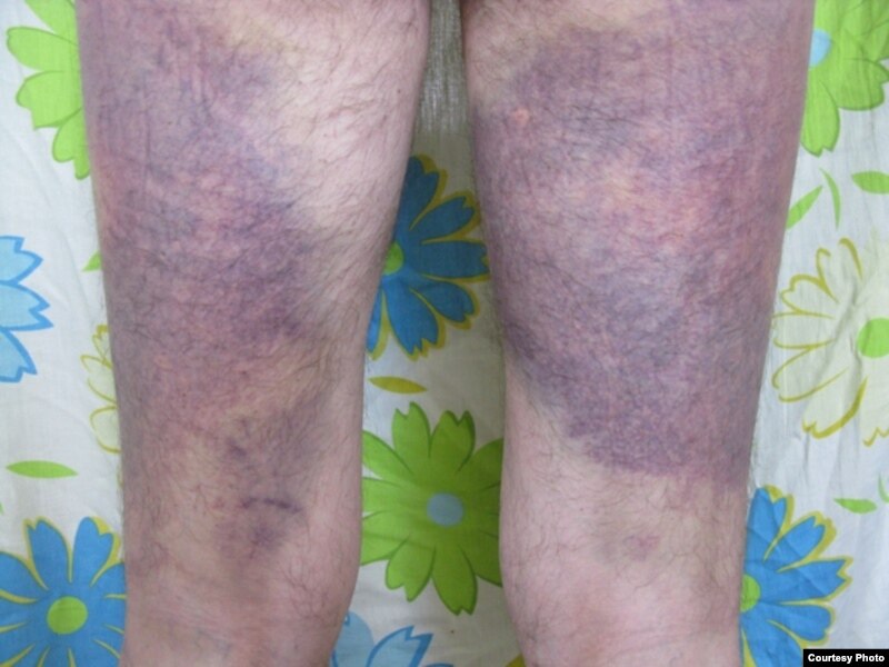 Айыпталушы Валерий Твердохлебтің туыстары соққыдан көгерген оның аяғын ҰҚК тергеуінен кейін суретке түсіріп алғанын айтады. Сурет айыпкердің туыстарынан алынды. Жақсы ауылы, Ақмола облысы. 30 қазан 2009 жыл.