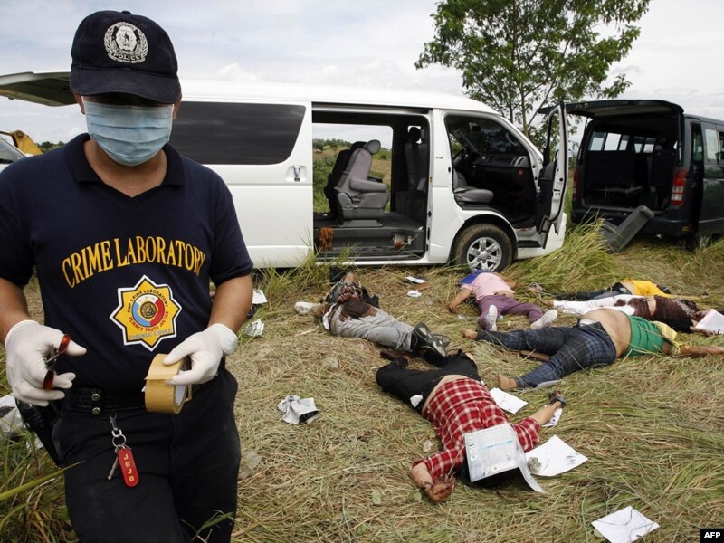 Филиппин полицейі қылмыс болған жерді зерттеуде. Адамдарды ұрлап әкетіп, атып тастаған қаскүнемдердің қолынан қаза тапқан 57 кісінің арасында журналистер мен саясаткерлер де болған. Ампатуан, 24 қараша 2009 жыл.