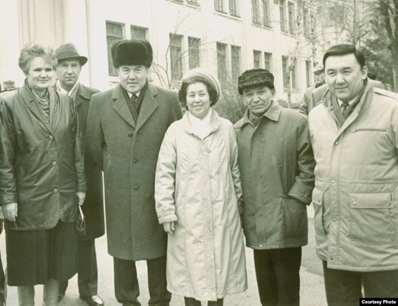 Жазушы Қалмұқан Исабай (оң жақтан екінші) зайыбымен бірге президент сайлауына дауыс беріп келе жатып, жолай жолыққан президенттікке жалғыз кандидат Нұрсұлтан Назарбаевпен (сол жақтан үшінші) түскен суреті. Алматы, 1 желтоқсан 1991 жыл. Жазушының жеке мұрағатындағы сурет.