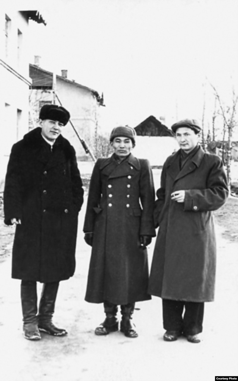 Совет армиясының офицері Қалмұқан Исабай (ортада) - Ильменау қаласының коменданты, Германия, 1945 ж. Жазушының жеке мұрағатындағы сурет.