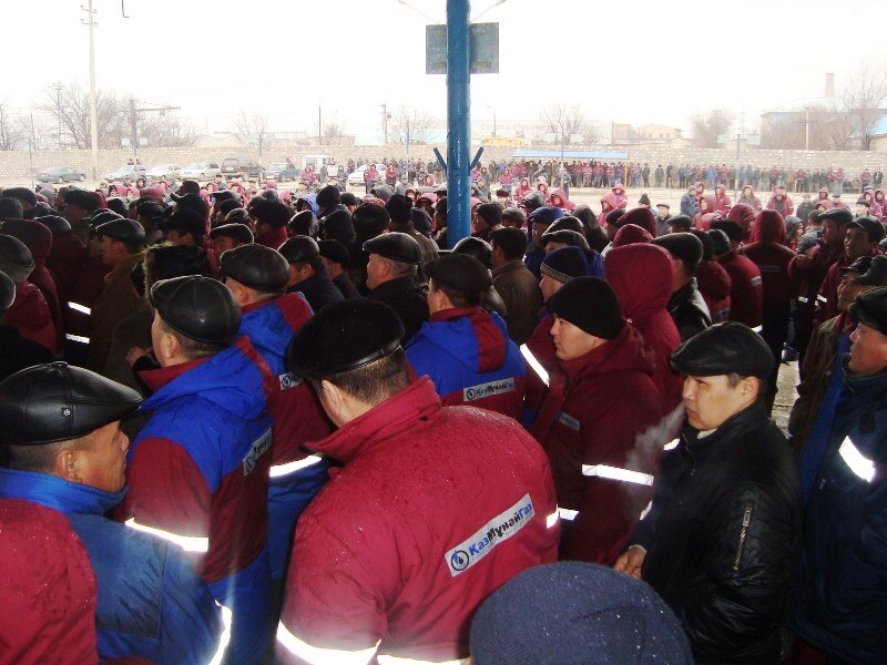 Жалақыға қосымша төленетін аймақтық коэффициентті қалдыруды талап еткен «Өзенмұнайгаз» өндірістік филиалының жұмысшылары жұмысты тоқтатып ереуілге шықты. Жаңаөзен, Маңғыстау облысы. 4 наурыз 2010 жыл. Жеке мұрағаттағы сурет.